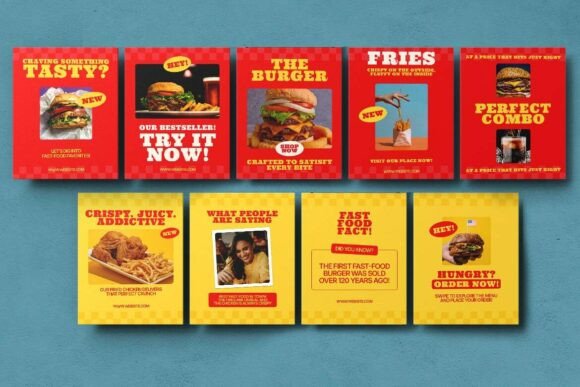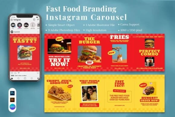Stop the scroll and start the cravings with our Fast Food Branding Instagram Carousel canva templates. Designed to trigger hunger and drive action, this collection is your secret weapon for growing a fast-food business in a digital-first world. Using a high-energy “bold red and yellow” color palette—the psychological gold standard for the food industry—these Instagram Post Canva templates ensure your menu items are the main attraction.