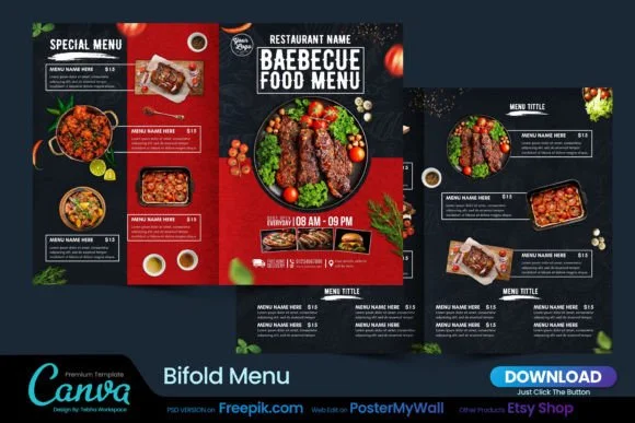 Featuring a high-impact Restaurant Menu canva Template, this set is designed to make your dishes pop against a moody, trendy background.